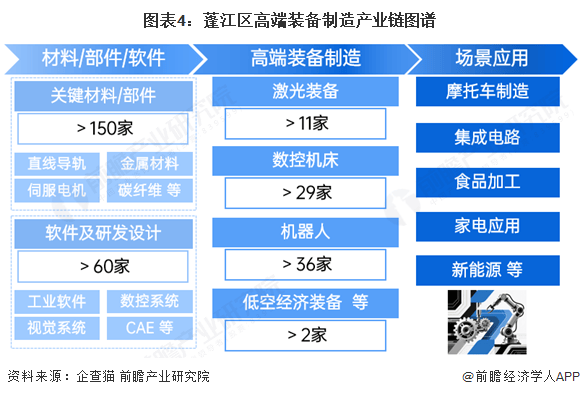 从企业类型数量分布来看,蓬江区高端装备制造产业链企业主要为上游关键材料与零部件企业,拥有超过150家基本材料与部件企业、100余家高端装备整机制造与集成企业,高端装备整机制造与集成企业中又以机器人与数控机床企业为主。