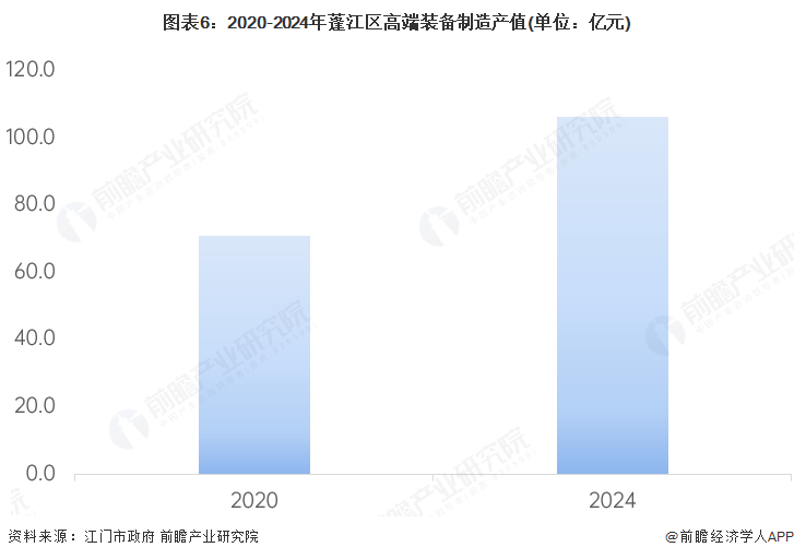 依托国家持续强化的产业政策支撑,顺应高端装备制造业高速增长态势,蓬江区紧扣“强链、补链、延链”主线,系统梳理产业链全要素资源,靶向开展产业链精准招商。截至2024年,蓬江区高端装备制造产值已经超过百亿元,达到106.38亿元。2025年上半年,高端装备制造产业集群有力支撑了蓬江规上工业经济的平稳增长,产业集群规模同比增长5.4%。