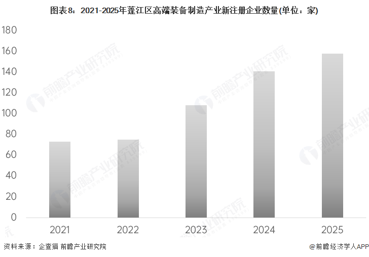 蓬江区高端装备制造企业数量不断增长,新注册企业数量也呈现出增长趋势,体现出该区域高端装备制造产业的向上发展,产业主体不断增多。2025年蓬江区高端装备制造新注册企业数量为158家,较去年增加17家。